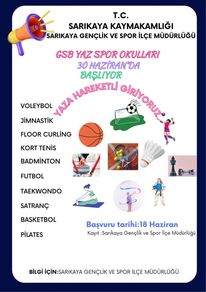 Sarıkaya da geleceğin hazinesi çocuklarımızın ve gençlerimizin fiziksel, zihinsel ve sosyal gelişimlerine büyük katkı sağlayan Sarıkaya Gençlik ve Spor İlçe Müdürlüğü yaz aylarında çocuklara, gençlere ve yetişkinlere ücretsiz yaz spor okulları imkanı sunacak.